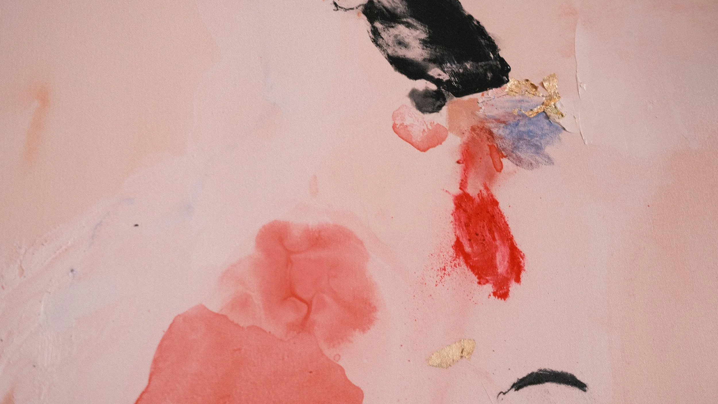 Abstract painting featuring peach, pink, red, black, gold, and light blue brushstrokes on a pastel pink background.