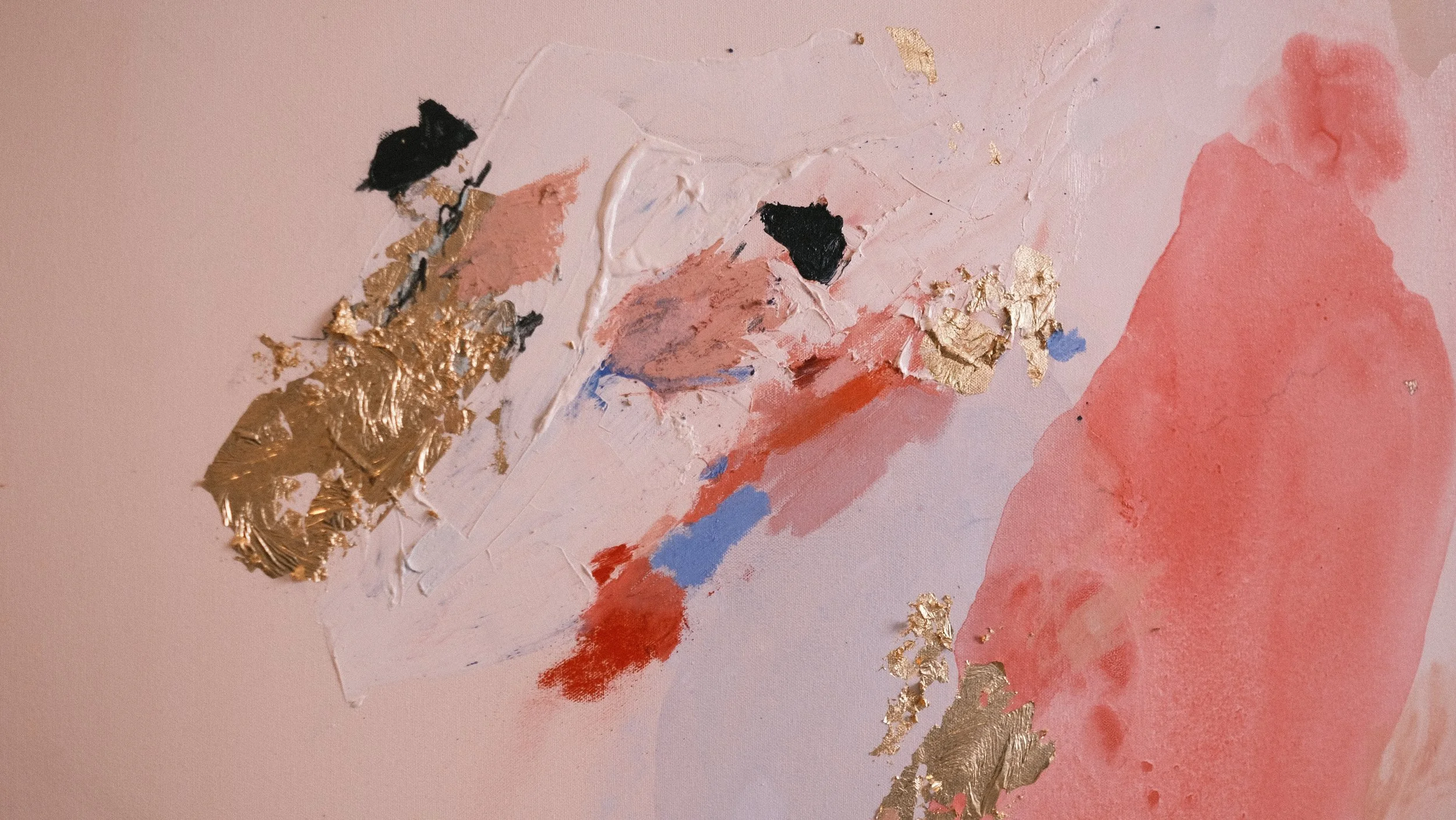 Abstract painting with pink, red, blue, black, white, and gold colors.