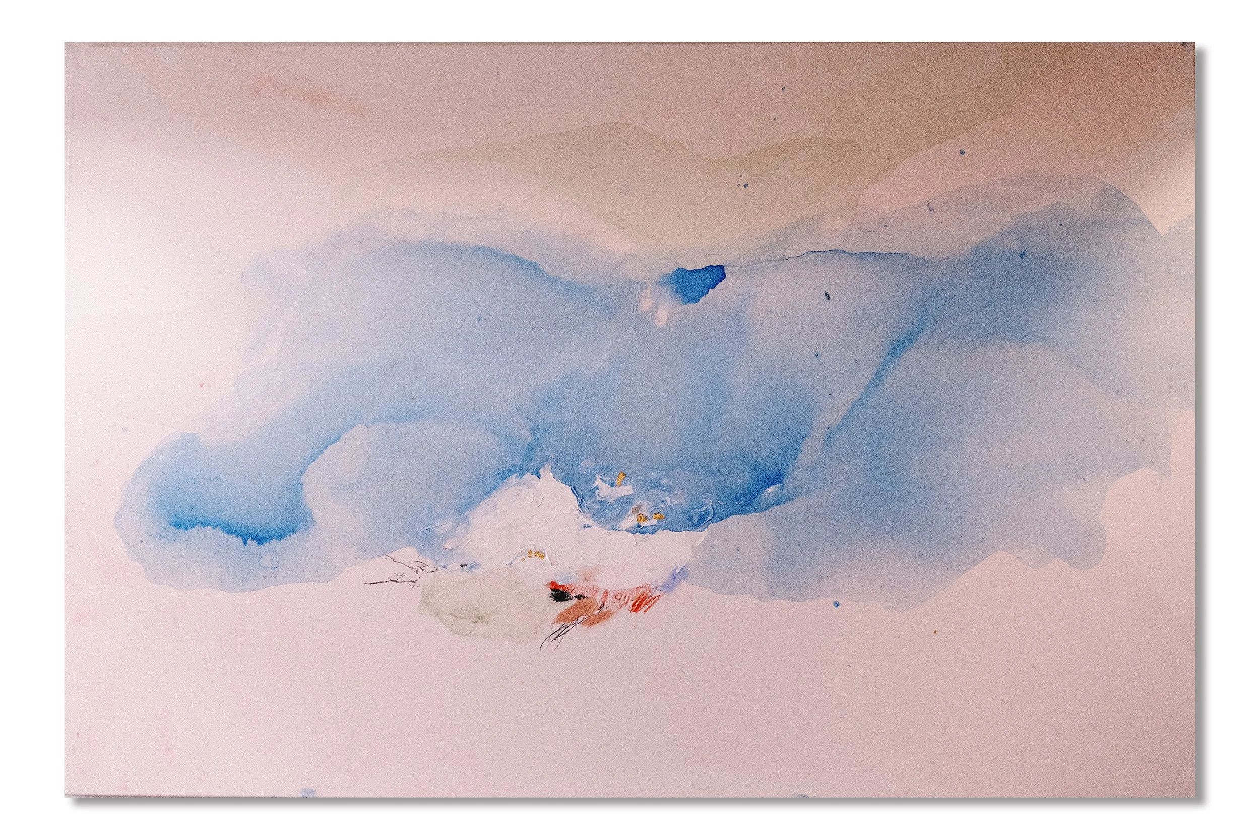 Abstract watercolor painting with shades of peach, red, green, blue, and black.