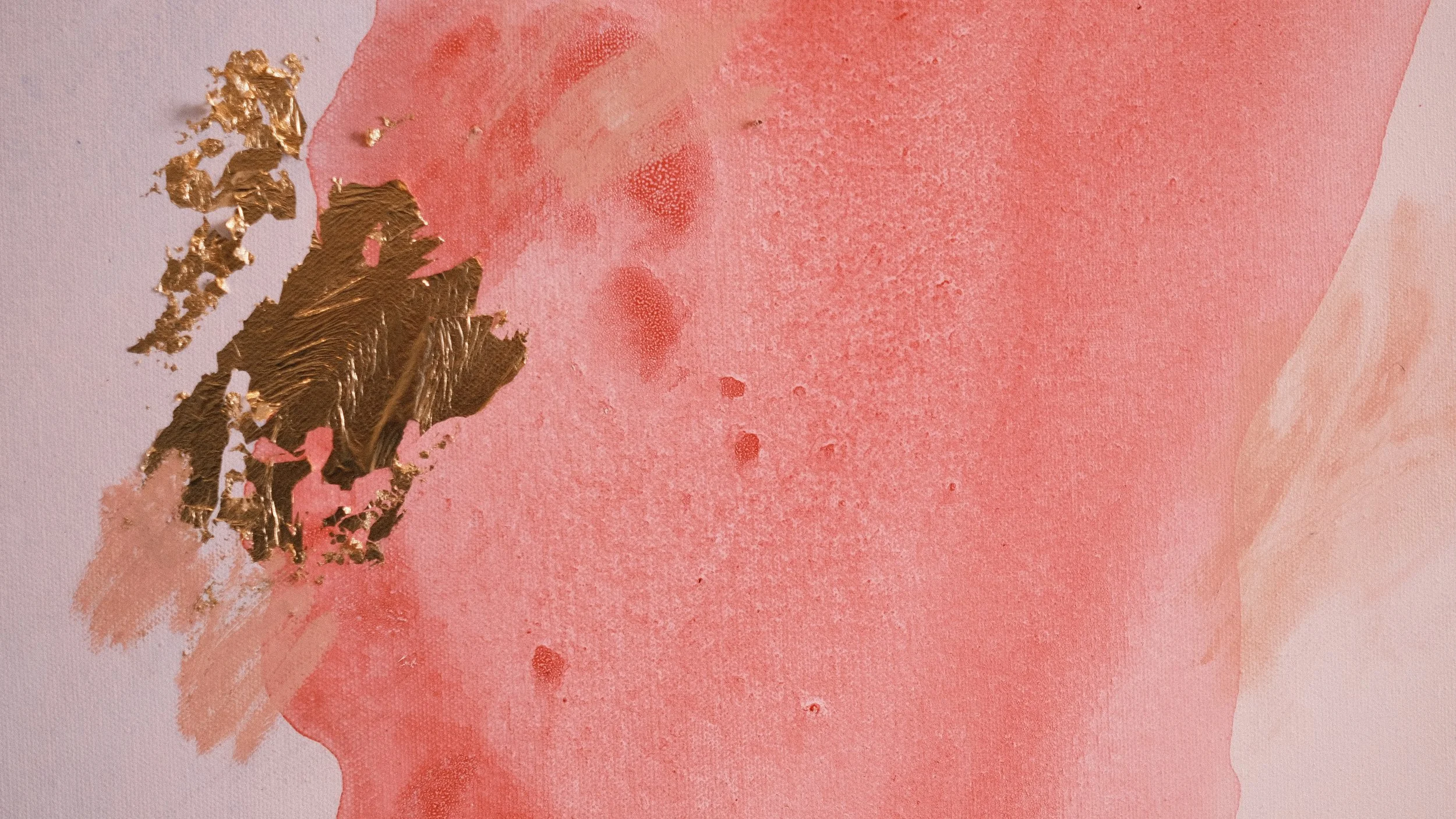 Close-up of a page with watercolor paint in reddish-orange, gold leaf accents, on a light pink background.